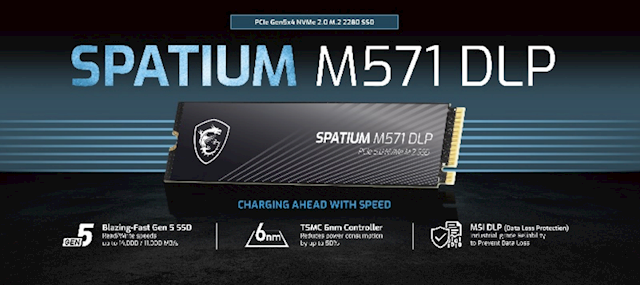 此外,微星推出旗舰级 SPATIUM M571 DLP 固态硬盘,采用PCIe Gen5 接口,顺序读写速度高达 14000/11000 MB/s。搭载台积电 6nm 主控芯片,在提升性能的同时实现能效优化,功耗降幅高达 50%。